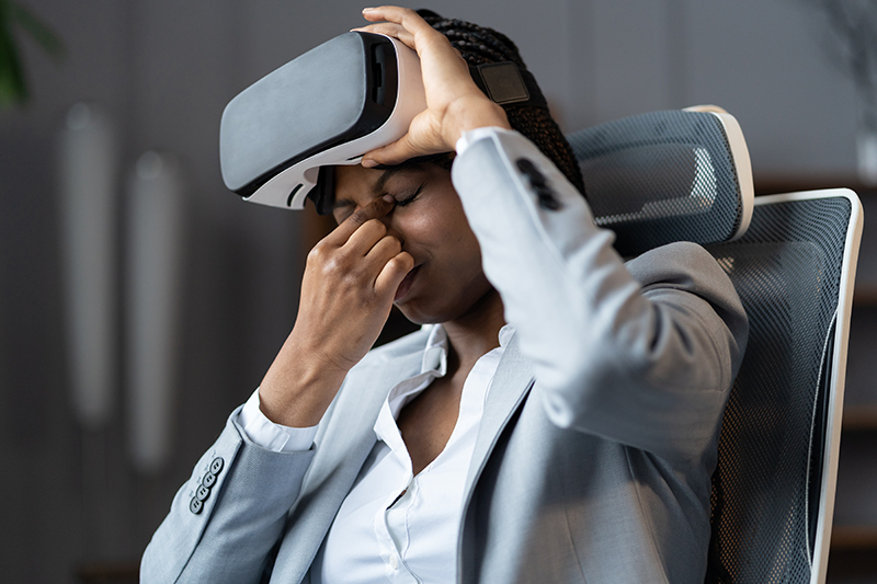 VRを使った研修では、頭痛や吐き気といった「VR酔い」が生じる可能性があります。これは視覚と身体感覚のずれによって起こり、乗り物酔いしやすい人ほど発症しやすいとされています。